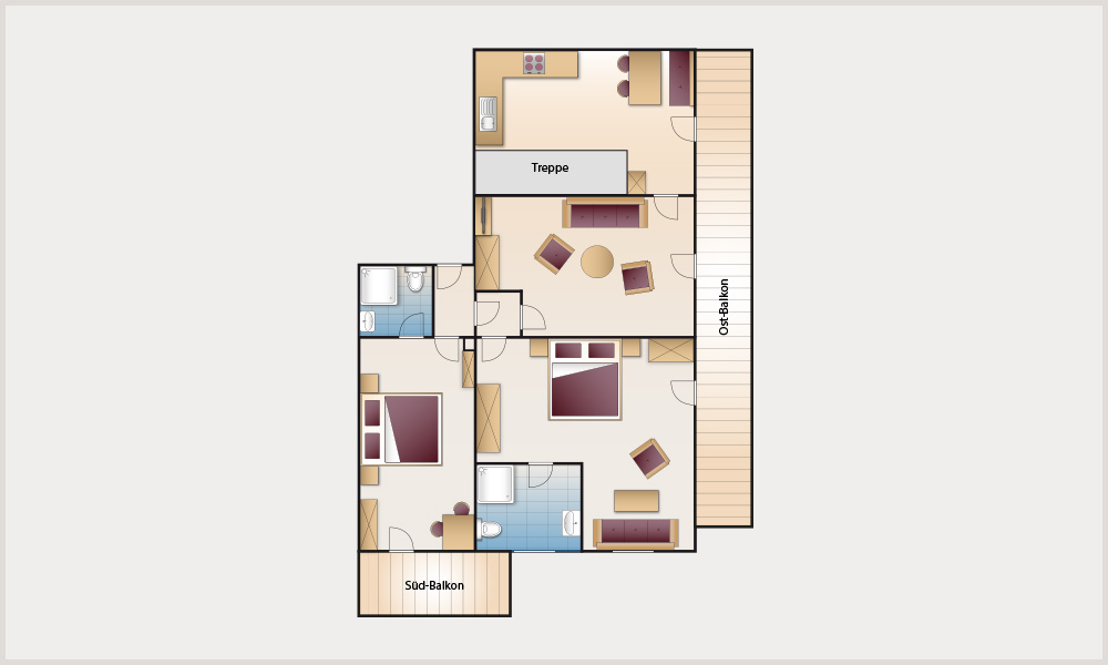 1. Stock | Wohn-/Schlafraum | 2 separate Schlafzimmer | separate Küche mit Essecke | 2 Bäder | Süd- und Ostbalkon